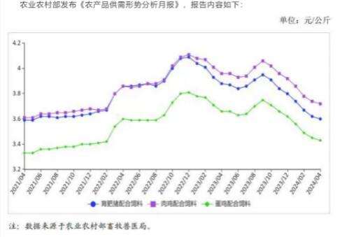 農(nóng)業(yè)農(nóng)村部發(fā)布《農(nóng)產(chǎn)品供需形勢分析月報》顯示,從周數(shù)據(jù)看,飼料價格已連續(xù)30周下跌,4月第3周育肥豬、肉雞、蛋雞配合飼料價格分別為每公斤3.59元、3.71元、3.42元,比上年9月價格高點分別跌9.3%、跌8.6%、跌8.8%。