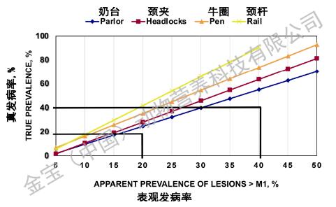 下圖是金寶公司開(kāi)展的關(guān)于不同評(píng)估場(chǎng)所估測(cè)>M1發(fā)病率的研究??梢耘袛?,在奶廳做的評(píng)估率準(zhǔn)確性最高。我個(gè)人認(rèn)為,無(wú)論在奶廳還是牛舍評(píng)估都可以很好地反映牧場(chǎng)中蹄疣的發(fā)生現(xiàn)狀。