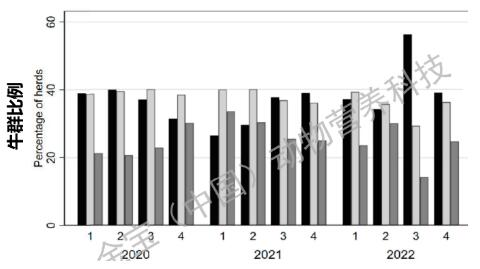間接監(jiān)測(cè)中,大缸奶樣的密螺旋體ELISA抗體檢測(cè)可以作為監(jiān)測(cè)工具,以此估測(cè)牛群或牧場(chǎng)的蹄疣發(fā)生情況。荷蘭已經(jīng)把該監(jiān)測(cè)計(jì)劃納入全國(guó)疾病防控管理計(jì)劃,下圖展示了荷蘭2020-2022年每個(gè)季度監(jiān)測(cè)的抗體水平,分為低抗體水平、高抗體水平和極高抗體水平。通過(guò)三年實(shí)施,抗體水平越低,蹄疣發(fā)生的風(fēng)險(xiǎn)越低,這也是非常好的定期監(jiān)測(cè)方法,國(guó)內(nèi)大型牧業(yè)集團(tuán)可以考慮采取這種方法。