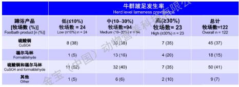 蹄浴試劑的選擇上,硫酸銅或福爾馬林是目前得到歐美國(guó)家大量科學(xué)數(shù)據(jù)證明的有效的蹄浴試劑,稱(chēng)為黃金選擇,其他商業(yè)蹄浴液試劑我們也持開(kāi)放態(tài)度,牧場(chǎng)可以嘗試。從加拿大統(tǒng)計(jì)數(shù)據(jù)可以看到,硫酸銅和福爾馬林是主流的蹄浴試劑。