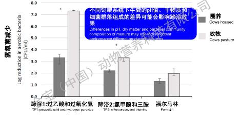 下圖展示了不同飼喂系統(tǒng)下的蹄浴液效果??梢钥吹?,圈養(yǎng)或放牧的情況下牛糞的pH值、干物質(zhì)和菌落組成不一樣,會(huì)造成蹄浴效果不一樣。這就解釋了為什么兩個(gè)牧場(chǎng)同樣的管理方式但蹄浴效果有差異,和營(yíng)養(yǎng)管理有關(guān)系。
