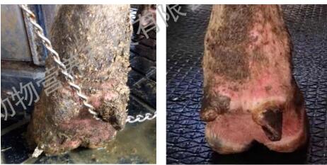 下圖所示蹄趾正在發(fā)生嚴(yán)重的炎癥反應(yīng),觸摸溫度很高,皮膚強(qiáng)度非常糟糕,在1-3個(gè)月后可能會(huì)增加蹄底潰瘍、白線病、變形蹄等風(fēng)險(xiǎn),同樣蹄疣發(fā)生風(fēng)險(xiǎn)很高。