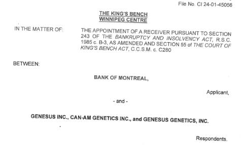 2024年1月15日寬限期滿,加裕公司仍無法償還貸款,蒙特利爾銀行遂向法院申請對加裕公司進行破產(chǎn)接管。2024年6月12日,法院判定BDO公司作為獨立第三方成為加裕公司(Genesus Inc.、Genesus Genetics)的接管人(Receiver)和經(jīng)理人(Manager)。