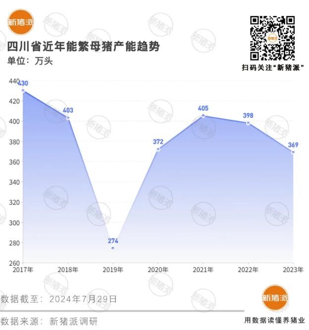 2023年,四川生豬出欄6662.7萬頭,再創(chuàng)歷史新高,占全國(guó)9.2%;年末能繁母豬存欄369萬頭。值得關(guān)注的是,在非瘟前,四川擁有430萬頭能繁母豬,同期出欄最高為6638萬頭,母豬生產(chǎn)效率從15.4增長(zhǎng)到18.1,提升了17.5%,反映出四川養(yǎng)豬規(guī)?;降目焖偬嵘?br>