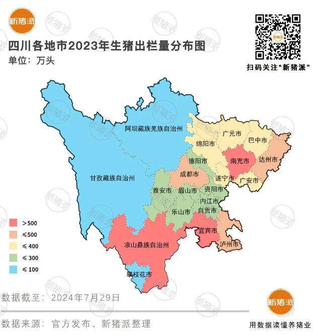 第三梯隊(duì):遂寧、廣元、廣安、綿陽、巴中等地,五地生豬出欄量均在300-400萬頭,合計(jì)占全省的28.8%。