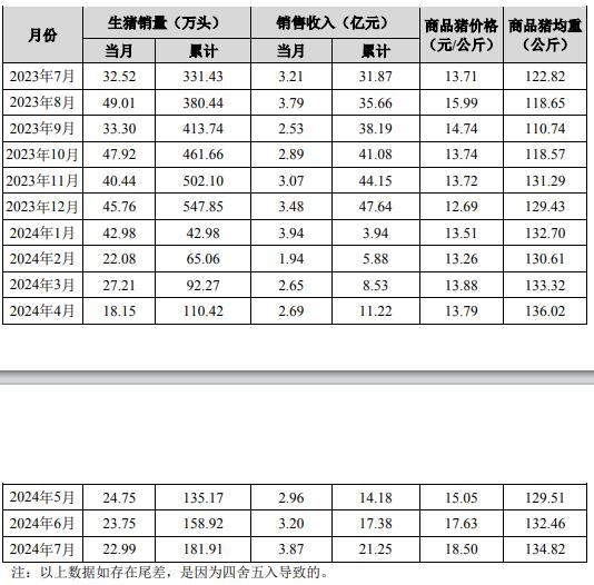 2024年1-7月,公司累計(jì)銷售生豬181.91萬頭,同比下降45.11%;累計(jì)銷售收入21.25億元,同比下降33.32%。