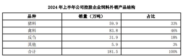 2024年上半年,公司控股企業(yè)飼料外銷量181.5萬噸,其中,預(yù)混料4.9萬噸,濃縮料33.9萬噸,配合料142.7萬噸。