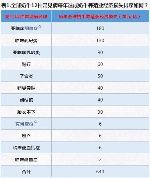 來自丹麥、加拿大、瑞士和英國(guó)全球頂級(jí)奶牛經(jīng)濟(jì)學(xué)家經(jīng)數(shù)年戮力合作、即將發(fā)表專門就全球飼養(yǎng)奶牛的所有183個(gè)國(guó)家和地區(qū),奶牛12種常見病分別給各國(guó)和全球奶牛養(yǎng)殖業(yè)造成經(jīng)濟(jì)損失的研究報(bào)告,參閱表1。這些經(jīng)濟(jì)損失包括奶產(chǎn)量+繁育力+淘汰率,但不含治療費(fèi)用。奶產(chǎn)量減少導(dǎo)致的經(jīng)濟(jì)損失按原奶標(biāo)準(zhǔn)價(jià)格估算;繁育力經(jīng)濟(jì)損失按額外增加的產(chǎn)犢間隔天數(shù),乘以每日奶產(chǎn)量,再乘以標(biāo)準(zhǔn)奶價(jià)來確定;淘汰成本則是根據(jù)增加提前淘汰風(fēng)險(xiǎn)進(jìn)行估算:投產(chǎn)健康頭胎牛價(jià)格-提前淘汰牛售價(jià),再乘以增加的風(fēng)險(xiǎn)率。不考慮治療費(fèi)用原因是:許多情況下,奶牛可能同時(shí)患有這12種常見病其中的數(shù)種,這無疑將導(dǎo)致總疾病成本出現(xiàn)重復(fù)計(jì)算誤差。研究人員曾根據(jù)這12種常見病之間的統(tǒng)計(jì)關(guān)聯(lián)對(duì)數(shù)據(jù)進(jìn)行了調(diào)整;如果不剔除治療費(fèi)用,全球奶牛養(yǎng)殖業(yè)因這12種常見病造成的平均總損失則會(huì)被高估45%。