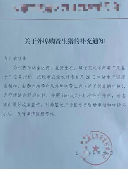 北方某地發(fā)布了一個通知,表示根據(jù)市農(nóng)業(yè)農(nóng)村委會議精神,鼓勵養(yǎng)殖戶從外埠購買肥豬進(jìn)行二次育肥,每頭豬補(bǔ)貼150元!