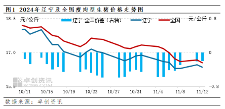 根據(jù)卓創(chuàng)資訊監(jiān)測,11月份遼寧生豬價格呈短暫上漲后下滑再低位盤整的運行態(tài)勢。2024年11月12日遼寧瘦肉型生豬交易均價16.35元/公斤,較月初累計下降0.53元/公斤,降幅3.14%。月內最高價為1日的16.88元/公斤,最低點為7-8日的16.30元/公斤,二者相差0.58元/公斤,幅度3.44%。