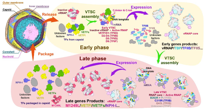該研究利用標(biāo)簽病毒從非洲豬瘟病毒感染的樣本中純化出病毒vRNAP,并利用冷凍電鏡解析了該復(fù)合體精細(xì)結(jié)構(gòu)。發(fā)現(xiàn)了病毒蛋白pM1249L參與病毒vRNAP復(fù)合體的形成,在病毒轉(zhuǎn)錄調(diào)控中發(fā)揮關(guān)鍵作用:在病毒復(fù)制早期充當(dāng)多種臨時(shí)轉(zhuǎn)錄因子角色,啟動(dòng)vRNAP活性,而在病毒復(fù)制晚期利用其C端結(jié)構(gòu)域促使vRNAP失活。早期合作研究發(fā)現(xiàn)病毒蛋白pM1249L參與病毒衣殼組裝及包裝過(guò)程(Science,2019),本研究又揭示了pM1249L參與病毒RNA聚合酶復(fù)合體形成,作為分子開(kāi)關(guān)調(diào)控病毒基因轉(zhuǎn)錄的新功能。該研究為揭示非洲豬瘟病毒感染與致病機(jī)制奠定了重要理論基礎(chǔ),為非洲豬瘟抗病研究提供新的候選靶標(biāo)。