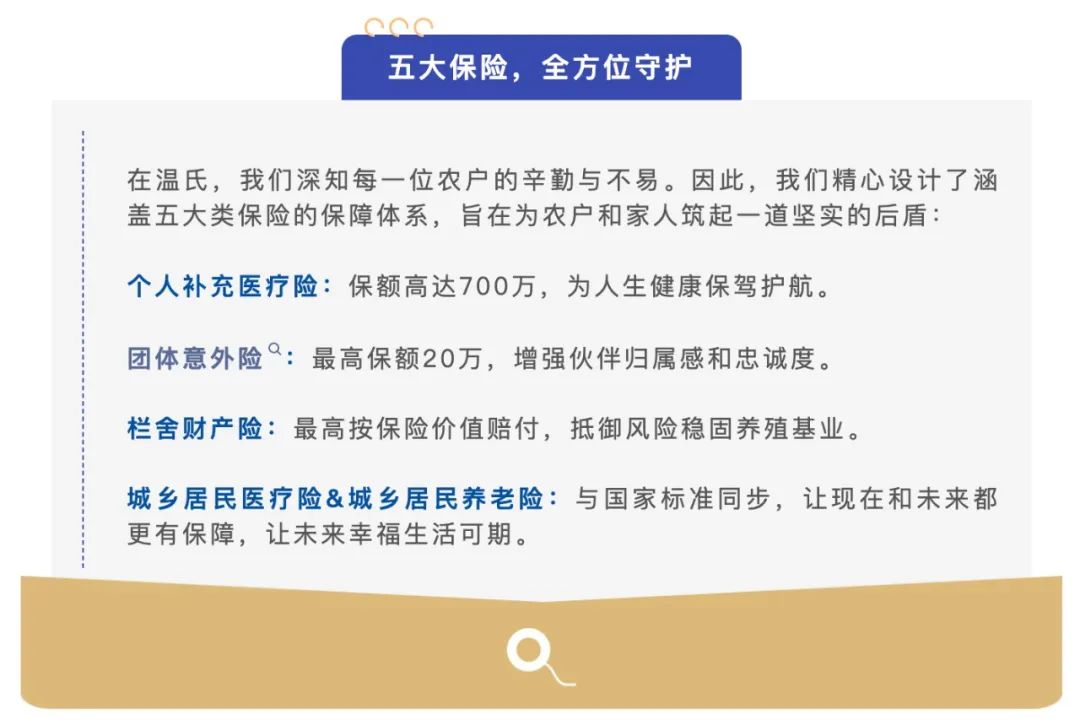 不僅如此,溫氏股份還帶著滿滿的誠(chéng)意與關(guān)懷,將為每一位合作農(nóng)戶送上一份特別的禮物——“愛農(nóng)守護(hù)”計(jì)劃!為農(nóng)戶定制保險(xiǎn),讓農(nóng)戶老有所養(yǎng)、病有所醫(yī)、損失有所補(bǔ)償,這不僅是溫氏“精誠(chéng)合作,齊創(chuàng)美滿生活”企業(yè)文化核心理念的生動(dòng)體現(xiàn),更是溫氏積極響應(yīng)國(guó)家倡議,為帶領(lǐng)合作農(nóng)戶實(shí)現(xiàn)共同富裕奠定堅(jiān)實(shí)基礎(chǔ)的一大創(chuàng)新。