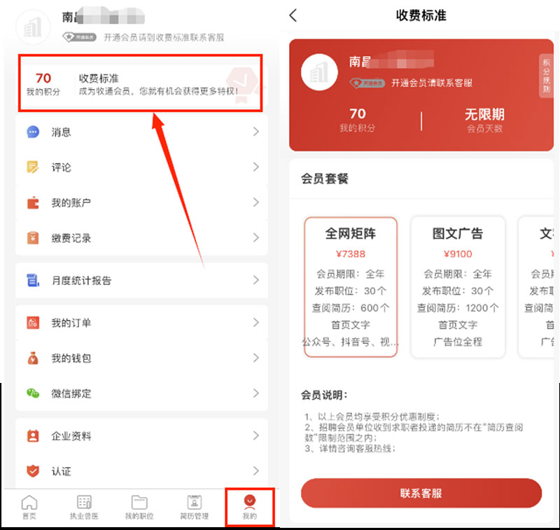 3、未開通會員,招聘信息將一直停留在“審核中”或“未通過”狀態(tài)。可在app底部點擊“我的”來到個人中心頁面,點擊“收費標(biāo)準(zhǔn)”,可看到會員套餐,左右滑動可選擇開通符合企業(yè)招聘需求的套餐。也可聯(lián)系客服,讓客服為您提供周到的講解服務(wù)。