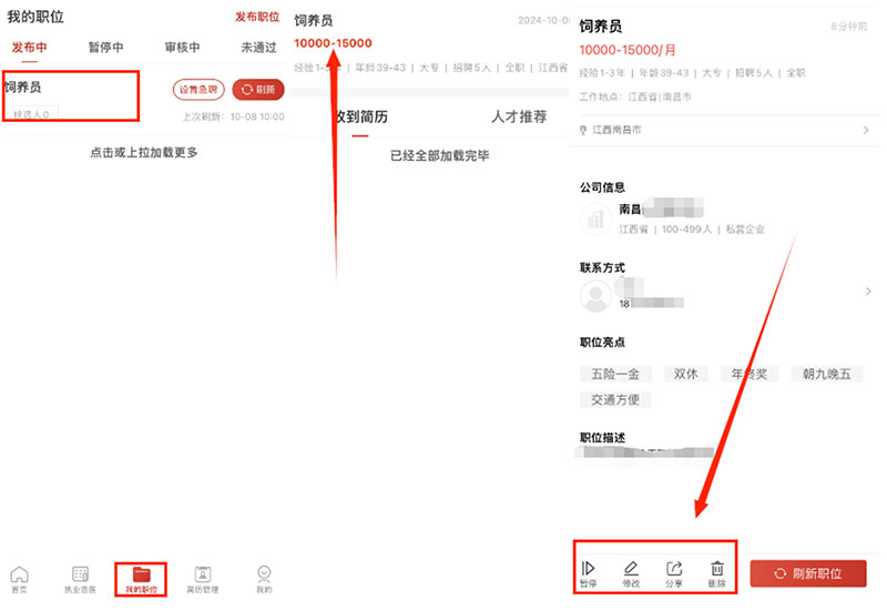 4、開通會員后,企業(yè)招聘信息成功展示,可設(shè)置“急聘”或刷新崗位(表示正在招聘中...)。如需暫停/修改/刪除正在“發(fā)布中”的某一職位信息,找到該崗位并點擊—崗位跳轉(zhuǎn)到獨立頁面后再次點擊,頁面下方有暫停/修改/刪除按鈕(如圖3),點擊需要操作的按鈕即可。