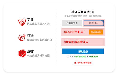 1、注冊/登錄時請?zhí)顚懻鎸嵱行У?span>電話號碼,便于您日后登陸和接收求職者應(yīng)聘信息。