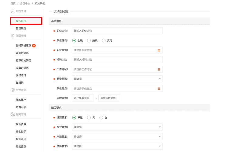 3、點擊左側(cè)的“發(fā)布職位”,填寫好相應(yīng)的崗位要求后,點擊“確認(rèn)提交”按鈕即可發(fā)布。注:若未辦理會員招聘、信息不被展示在網(wǎng)站上。(小貼士:有“*”標(biāo)注的項目為必填項。)