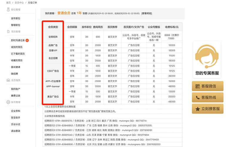 4、如下圖,點擊“開通會員”可見具體收費標(biāo)準(zhǔn)。也可前往會員中心,右側(cè)有聯(lián)系客服通道,通過咨詢客服選擇符合企業(yè)招聘需求的會員套餐。